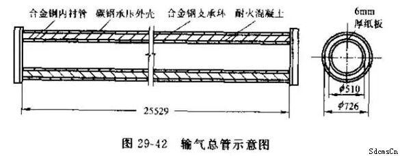 輸氣總管長25.5m,該管為碳鋼承壓外殼,殼的外面設有水夾套進行冷卻,內徑為Φ726mm,管內為不銹鋼(Cr18Ni8)襯套管,襯套管外徑和碳鋼外殼內徑之間,澆注純鋁酸鈣水泥空心球輕質耐火混凝土。該管的環形空間在其長度方向被內襯套管的合金鋼支承環分隔26節,如下圖所示。每節為一澆注單元,逐節進行澆注。