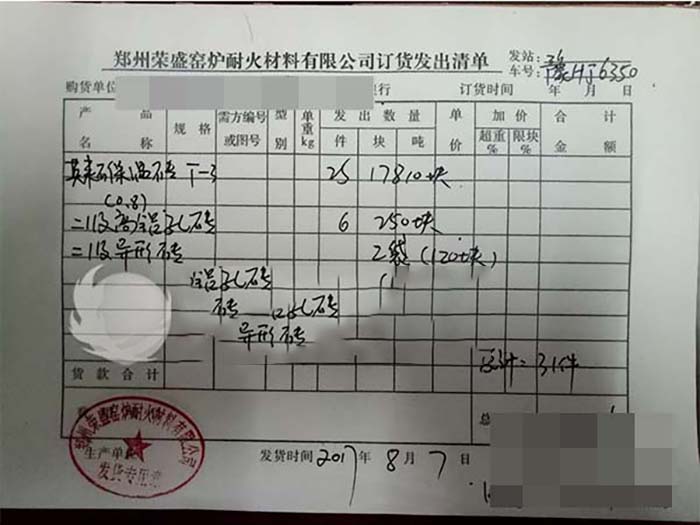 這次發貨的對象是江西的客戶,江西的客戶要了17810塊t-3莫來石保溫磚、250塊二級高鋁孔磚、120塊二級異型磚。江西客戶也是榮盛的老客戶了,這次的訂單江西客戶對榮盛表現出了十分的信任,并沒有派人再到鄭州進行考察,是直接給榮盛銷售達到電話訂的單,并且在電話里表達出了想和榮盛保持長期合作的態度,出于對合作伙伴的支持,榮盛也給了江西客戶優惠的價格。